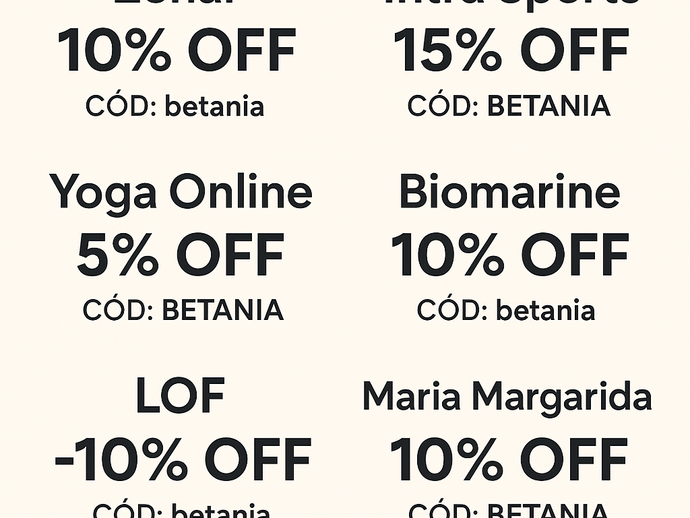 CUPONS DE DESCONTO EXCLUSIVOS COM O CÓDIGO BETANIA Aproveite agora os melhores descontos em marcas incríveis! Use o código BETANIA e garanta vantagens exclusivas nas suas compras online. 💚 Zenai – 10% OFF 👉 Use o código: betania e economize em produtos de autocuidado e bem-estar. 💪 Intra Sports – 15% OFF 👉 Use o código: BETANIA e tenha o melhor em suplementos e nutrição esportiva com desconto especial. 🧘♀️ Yoga Online – 5% OFF 👉 Use o código: BETANIA e aproveite